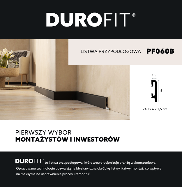 - Listwa przypodłogowa premium Floor Durofit, o szerokości 6 cm, wyróżnia się elegancją, funkcjonalnością i trwałością dzięki zastosowaniu innowacyjnego polimeru UltraHDCore®, jest łatwa w montażu i odporna na wilgoć.