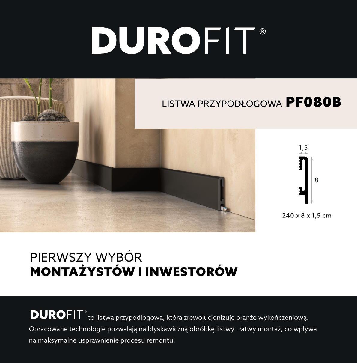 - Elegancka i trwała listwa przypodłogowa Floor Durofit o szerokości 8 cm, wykonana z innowacyjnego polimeru UltraHDCore®, gotowa do montażu bez malowania, doskonale komponująca się z różnymi stylami wnętrz dzięki uniwersalnej czerni RAL9004.