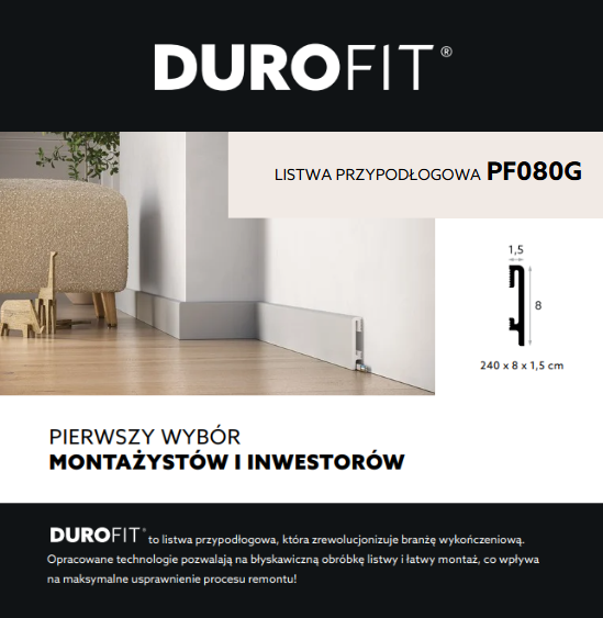 - Listwa przypodłogowa premium Floor Durofit, szara, o wymiarach 240 cm x 8 cm, wyprodukowana z innowacyjnego polimeru UltraHDCore® oferuje wysoką odporność na uszkodzenia i wilgoć, nie wymaga malowania, a jej montaż jest prosty i szybki.