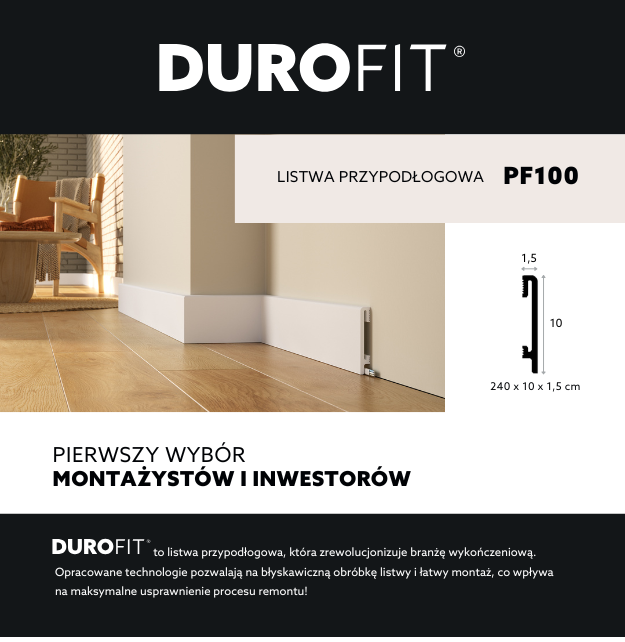 - Listwa przypodłogowa Floor Durofit biała 10 cm to produkt premium, odporny na wilgoć i uszkodzenia, łatwy w montażu, z innowacyjnego polimeru UltraHDCore®, o uniwersalnym kolorze i wymiarach 240 cm x 10 cm x 1,5 cm.